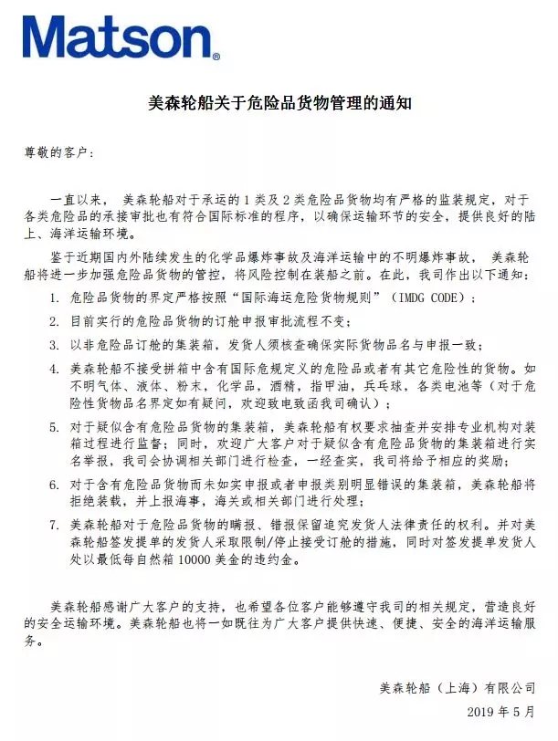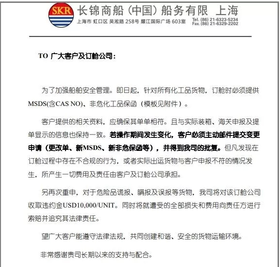 不仅查验力度可以预见的将加强,接下来船公司对于危险品的管控,也会更加严格。最近,各船公司、船代都发布或者重申了和危险品订舱相关的通知,我们为大家汇总如下: