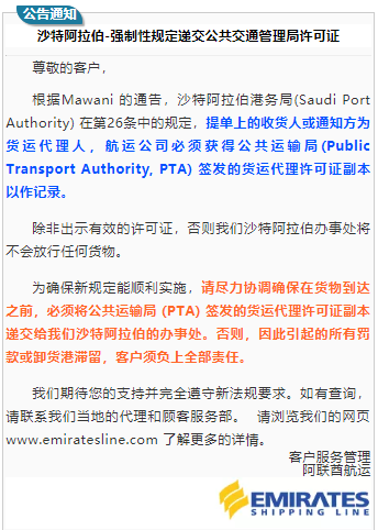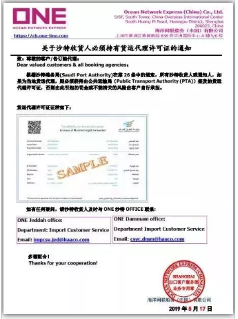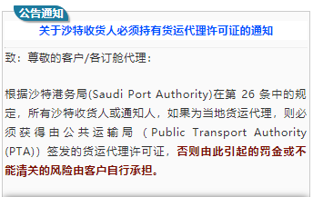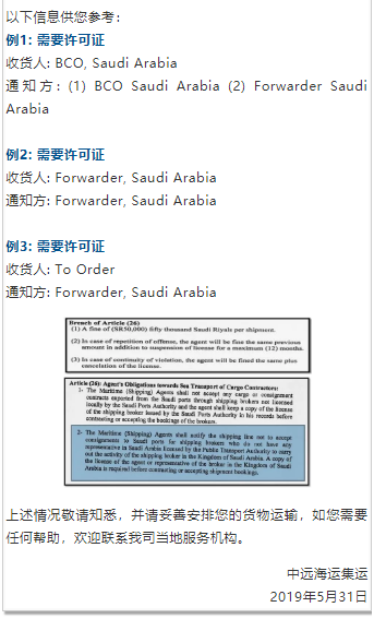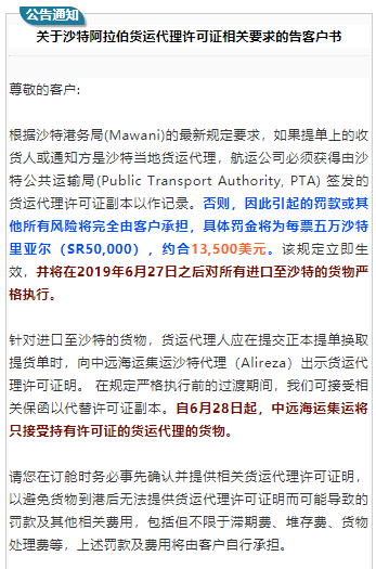 中国航贸微平台消息,中远海近日发布公告,根据沙特港务局(Mawani)的最新规定要求,如果提单上的收货人或通知方是沙特当地货运代理,航运公司必须获得由沙特公共运输局(Public Transport Authority,PTA) 签发的货运代理许可证副本以作记录。否则,因此引起的罚款或其他所有风险将完全由客户承担,具体罚金将为每票五万沙特里亚尔(SR50,000),约合13,500美元。该规定立即生效, 并将在2019年6月27日之后对所有进口至沙特的货物严格执行。 在规定严格执行前的过渡期间,可接受相关保函以代替许可证副本。自6月28日起,中远海运集运将只接受持有许可证的货运代理的货物。