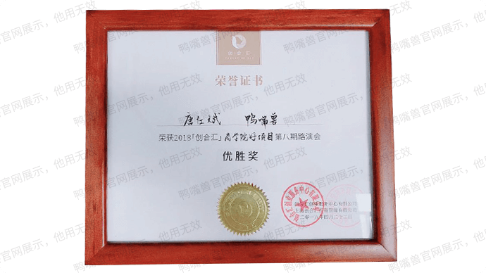 2018年4月,鸭嘴兽获2018"创合汇"商学院好项目第八期路演会优胜奖